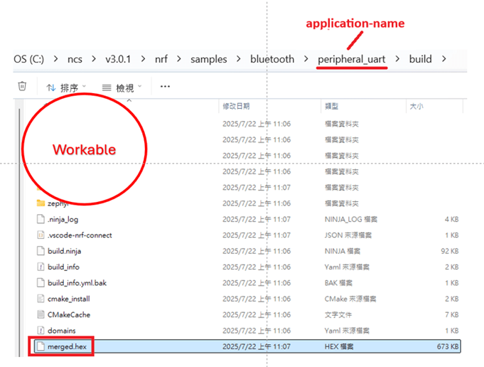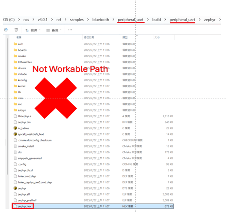 Not recommended path: 2. ..\nrf\samples\bluetooth\application-name\build\application-name\zephyr\zephyr.hex The zephyr.hex file is not recommended to be used for flashing or verification in the production process.