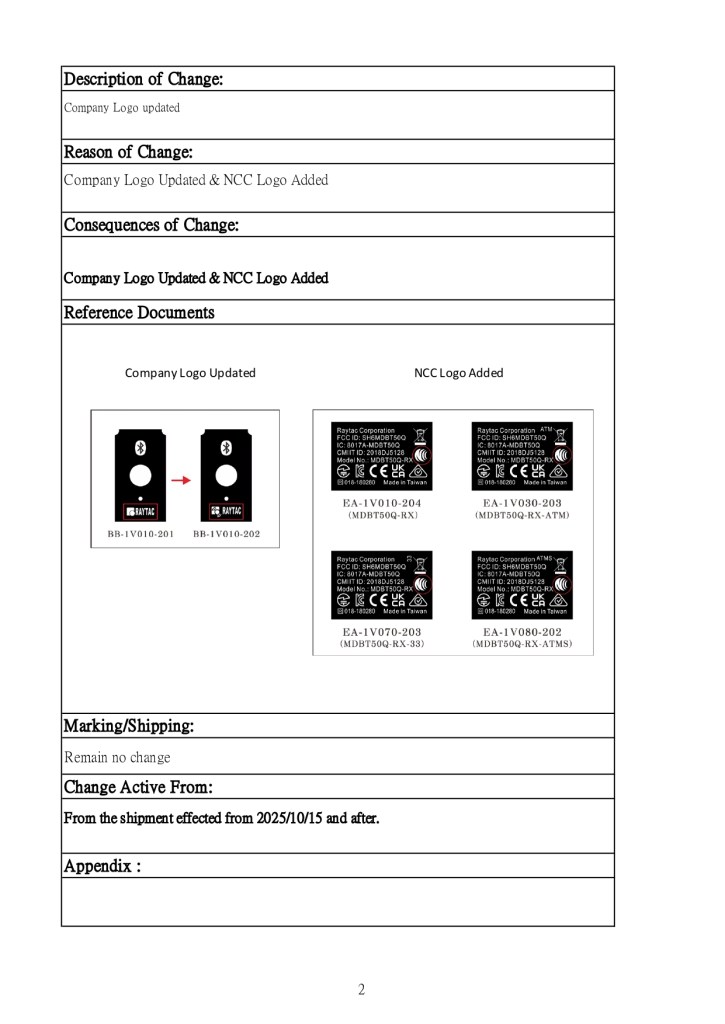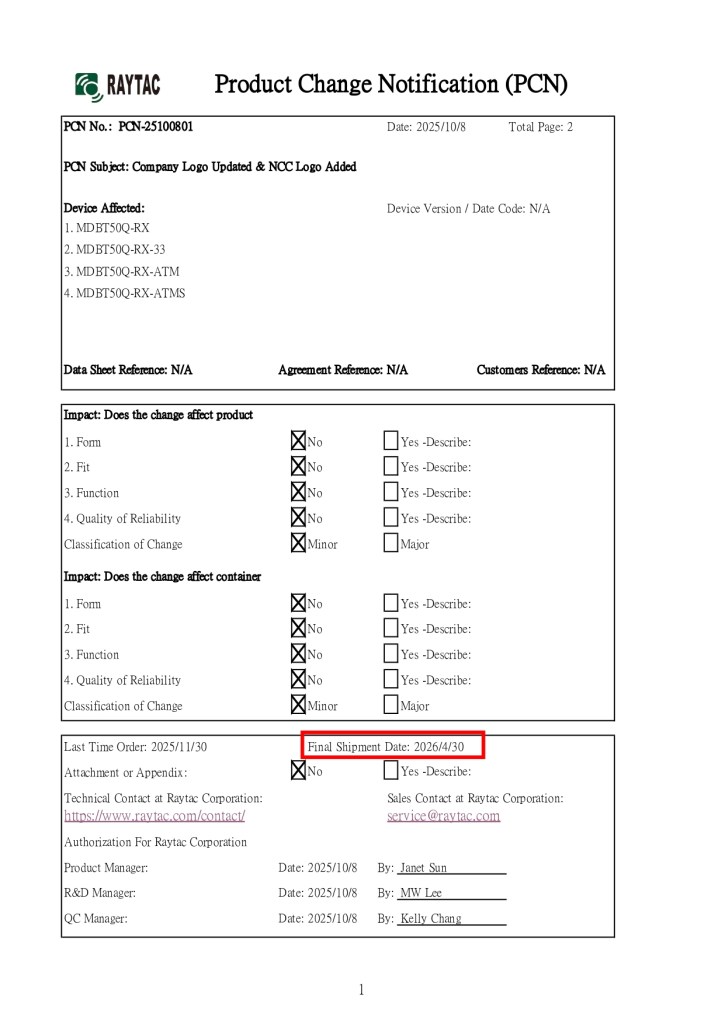 Raytac Corporation would like to inform all customers and partners of an official Product Change Notice: PCN-25100801 regarding the following product series: