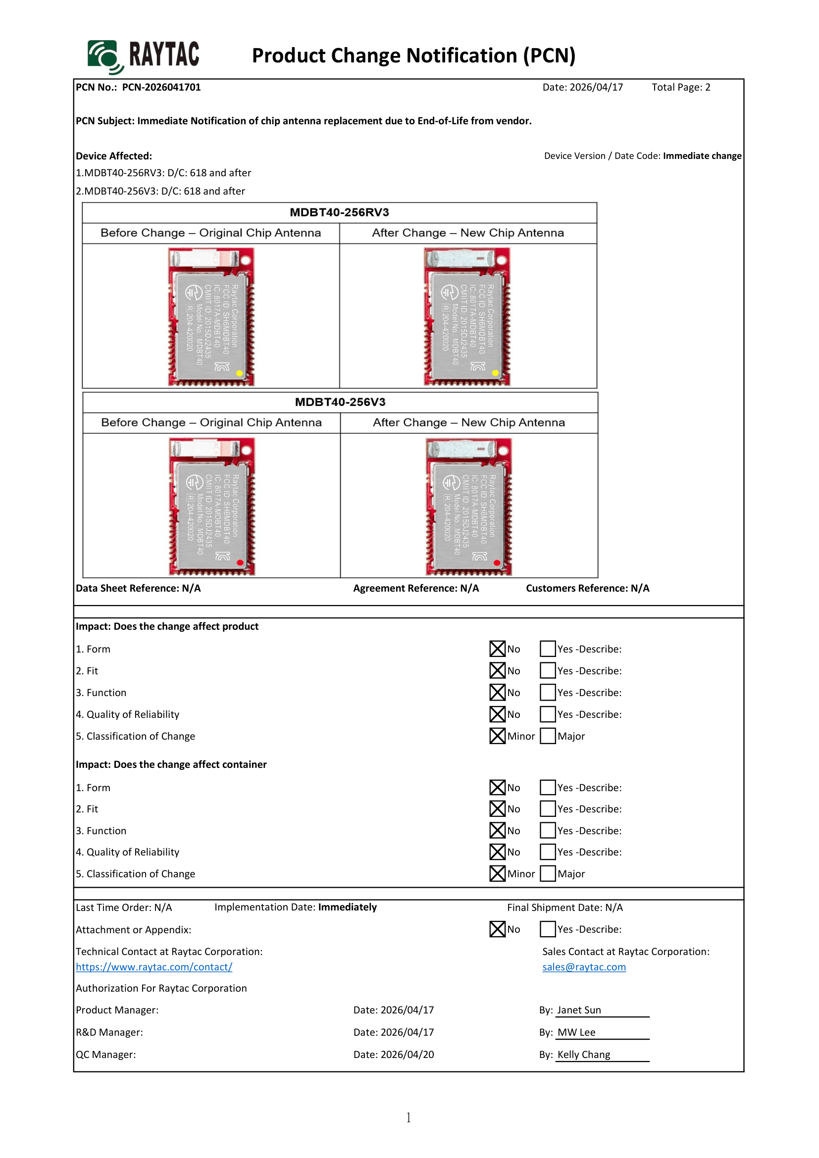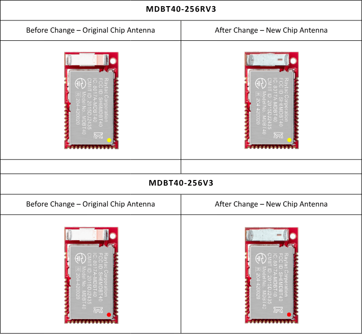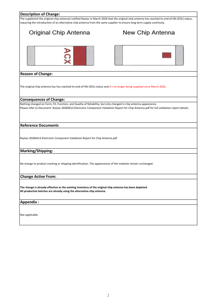 The supplier(of the original chip antenna) notified Raytac in March 2026 that the original chip antenna has reached its end-of-life (EOL) status, thus the introduction of an alternative(new) chip antenna from the same supplier to ensure long term supply continuity.