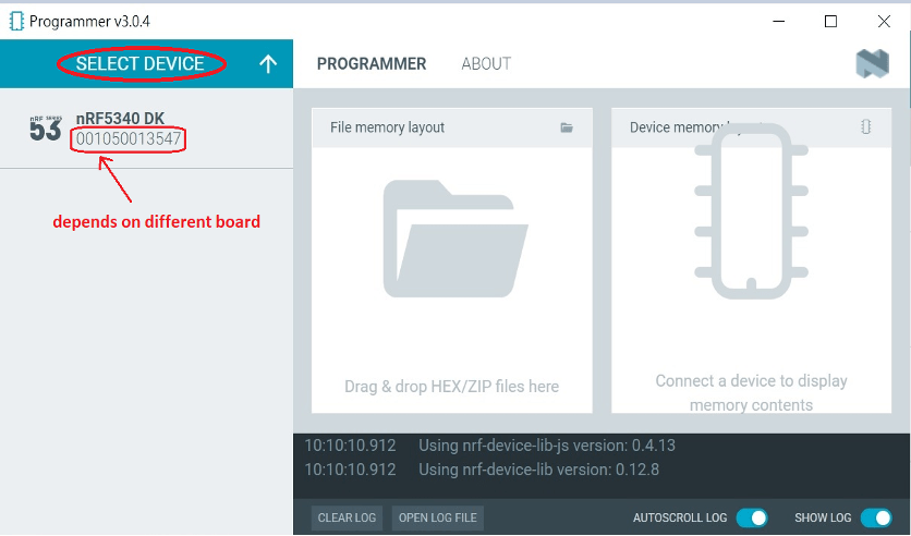 Click “SELECT DEVICE” >> Find icon of “nRF5340 DK” which is detected by the programmer app