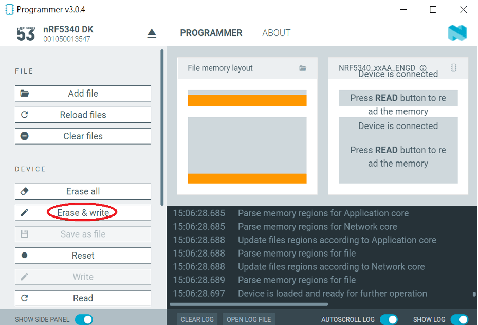 Do “Erase & Write ” to execute the flashing process for both zephyr.hex into memory of MDBT53/53V Module.