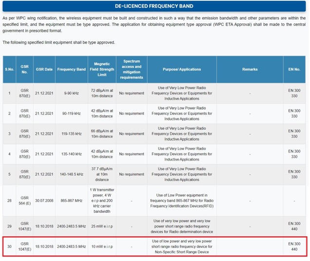 To specifically recognize what is the compliance regulation of equipment applies to Raytac Bluetooth module, we can be assured with our Bluetooth module spec located within “De-licensed Frequency Band list” , 2400-2483.5MHz / Limit with 10mW EIRP / Use of low power and very low power short range radio frequency device for Non-Specific Short range device, from the following chart which was released from WPC authority.