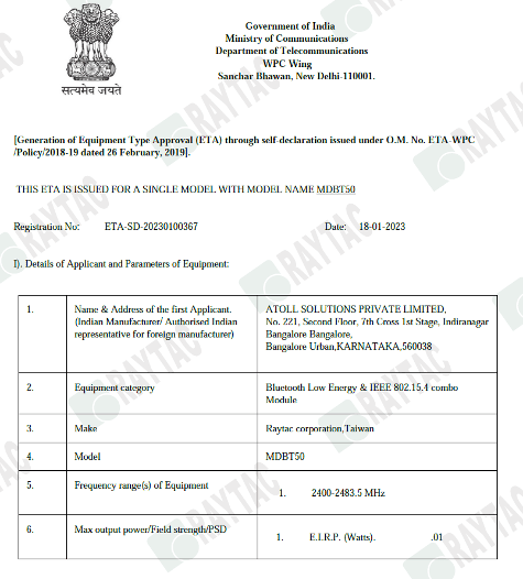Once we confirm Raytac Bluetooth module spec is operated in De-License Frequency Band with low transmission power, at the mean time making sure the device is exempt from import license as per Import Policy of DGFT (Directorate General Of Foreign Trade), Ministry OM ETA-WPC-Policy-2018-19 dated 26th February 2019, free from EXIM Policy of DGFT, Raytac is granted to apply for “ETA Through Self-declaration” application procedure which was enabled by SARAL SANCHAR Portal of DoT on 12th April, 2019.