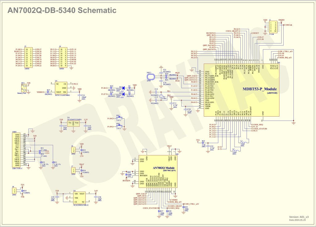 !! Important Note:!! The circuit of SW1(p1.08)/SW2(p1.09)/LED1(p1.06) on AN7002Q-DB-5340-M is NOT COMPATIBLE to Nordic WI-FI Control Pin of swctrl1(p1.08)/host_irq(p1.09)/grant(p1.06). In this case, if you’re working with external flash MX25R64 for the WIFI project, Please avoid pin SW1/SW2/LED1 usage while LED2(p1.07) remains available as normal usage. For the design perspective of mother board/carrier board /target board (mounted with AN7002Q & MDBT53 modules), it is required to design the circuit align to SW1(p0.23)/SW2(p0.24)/LED1(p0.28).