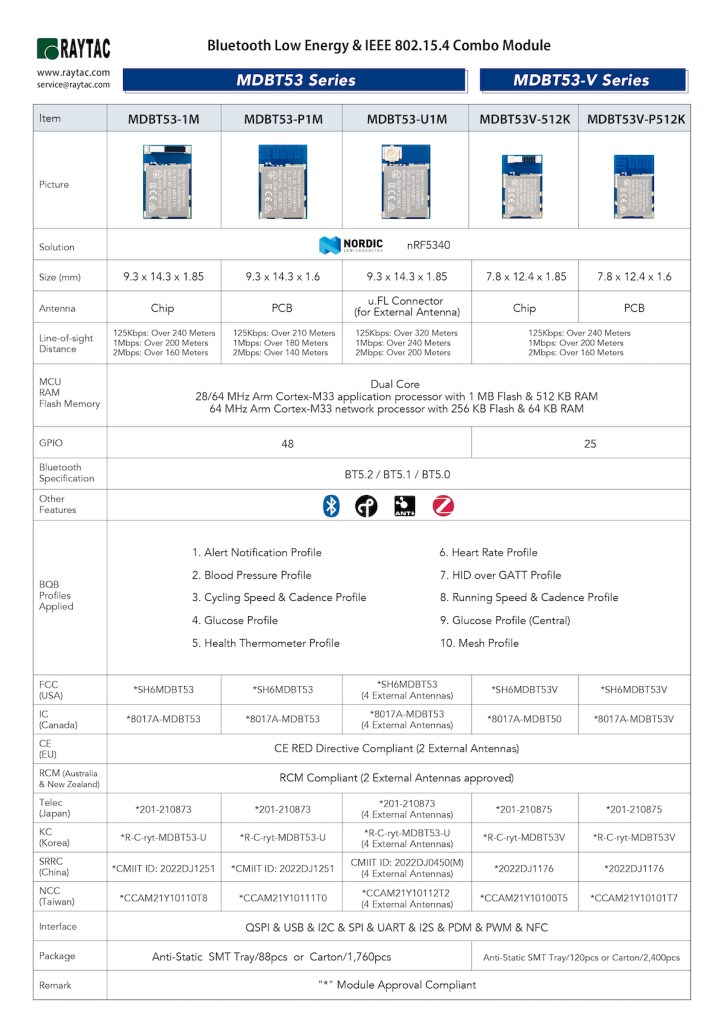 Raytac released 5 modules with 2 form factors, MDBT53 and MDBT53V,  with different antenna options for selection. The modules deployed nRF53 SoC supports high-speed SPI, QSPI, USB, I2C, I2S, and NFC interface and 105°C industrial temperature specification. BT5.3 pre-qualified, FCC/IC/CE/Telec (MIC)/KC/SRRC/NCC pre-certified is a MUST for all Raytac modules.